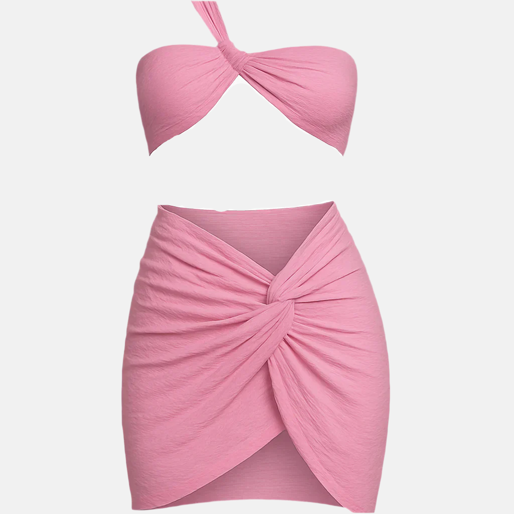 The Capri One-Shoulder Twist Bikini Set includes a twisted bandeau top with an asymmetrical strap, a matching cheeky-cut bikini bottom, and a draped mesh wrap skirt with a ruched side tie. The swimwear pieces are fully lined and made from soft stretch fabric with a matte finish. Color: Pink.