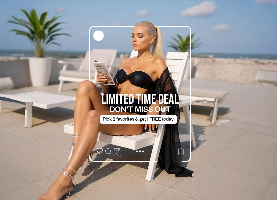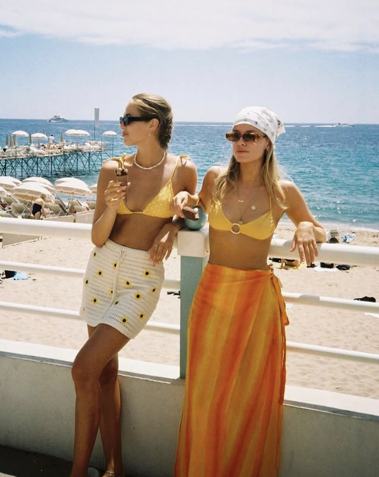 The Soleil Mesh Two-Piece Set includes a bandeau-style bikini top with a gold-tone starfish charm at the center front and a high-waisted ruched sheer maxi skirt. Made from lightweight stretch mesh fabric, the skirt has an elastic waistband and a soft drape. Suitable for layering over swimwear.